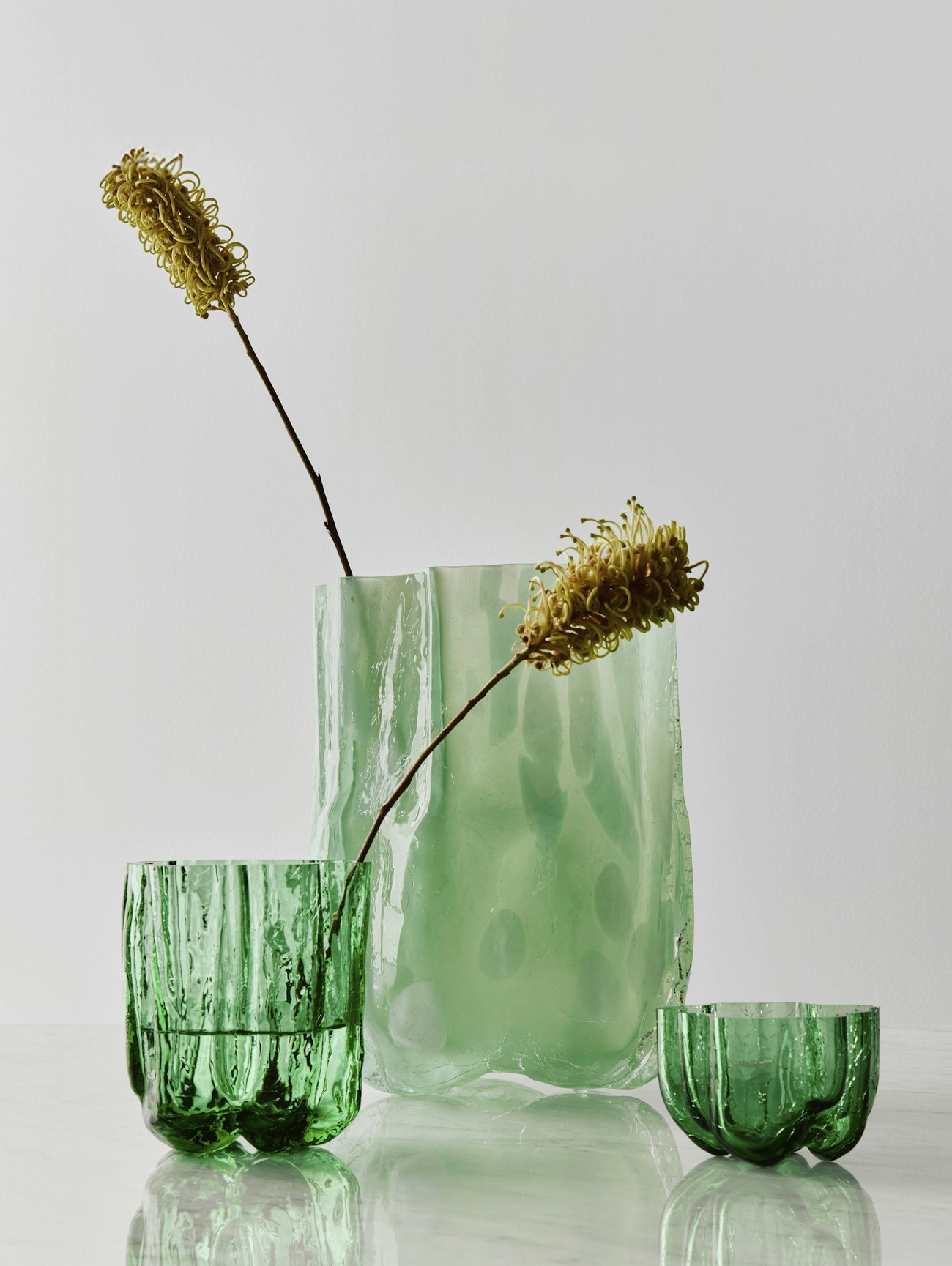 Crackle från Kosta Boda är en hyllning till sprickor, vackert bevarade i glas. Serien har ett skulpturalt och uttrycksfullt yttre som skapas med en gammal hantverksteknik, där det varma glaset doppas i iskallt vatten. Crackle är munblåst i Kosta och formgiven av Åsa Jungnelius.